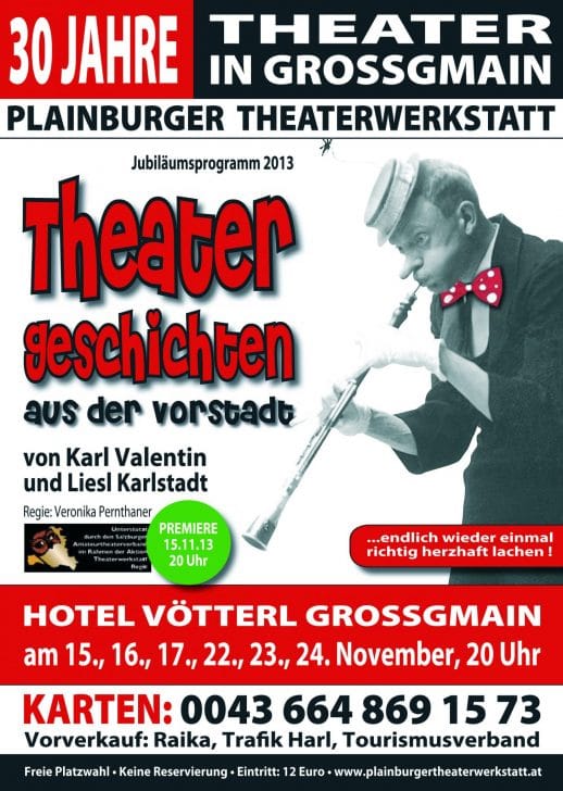 – Zum 30jährigen Jubiläum der Plainburger Theaterwerkstatt hat Regisseurin Veronika Pernthaner sechs kurze Bühnenstücke von Karl Valentin und Liesl Karlstadt zu einem bunten Theatererlebnis zusammengefasst. Moritatensänger führten durch den Abend und verbanden die Stücke zu einem harmonischen Ganzen. Für zahlreiche Besucher ein unvergesslicher Abend mit dem zeitlos subversiven Humor der beiden Paradekomiker Valentin und Karlstadt!