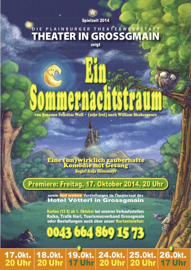 – Nach den überaus erfolgreichen Episoden von Karl Valentin und Liesl Karstadt im Jahr davor zeigte die Plainburger Theaterwerkstatt 2014 einen echten Theater-Klassiker! Susanne Felicitas Wolf hat das Stück im Stile bester Volksstücktradition komödienhaft interpretiert. Shakespeares ewig junger Stoff von Irrungen, Wirrungen, Poesie und Liebeszauber wird in der ideenreichen Inszenierung von Anja Hiessmayr zu einer liebenswert-quirligen Geschichte verwoben, in der Traum und Wirklichkeit märchenhaft miteinander verschmelzen.